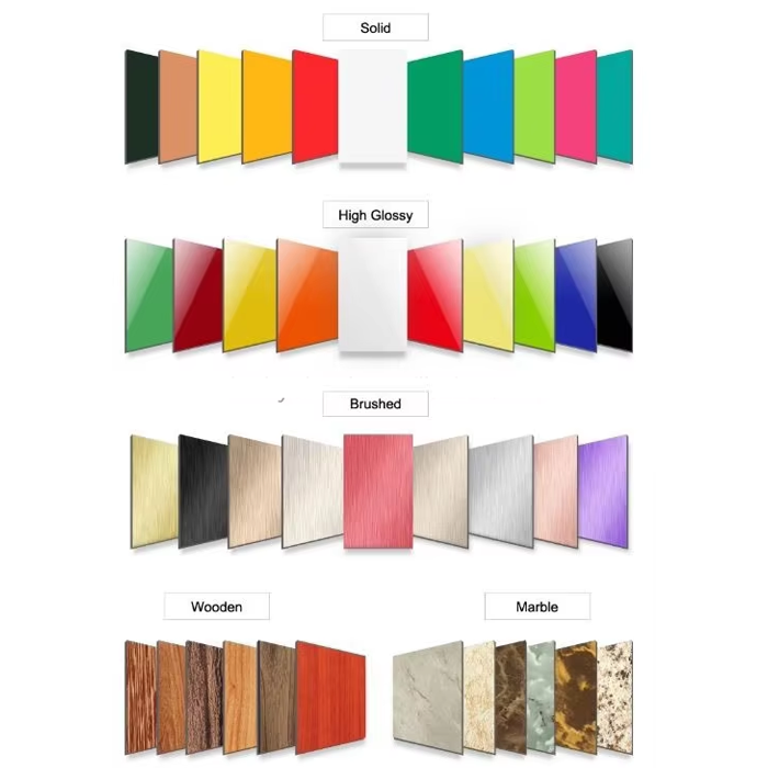 The Aluminum Composite Panel 3mm Alucobond ACP includes both polyester (PE) coatings and fluorocarbon coatings. PE is ideal for interior decoration and short-term outdoor use, while fluorocarbon coatings provide advanced protection for long-term exterior applications. More than 30 standard colors are available, including metallics, wood patterns, marble effects, brushed finishes, and mirror surfaces.